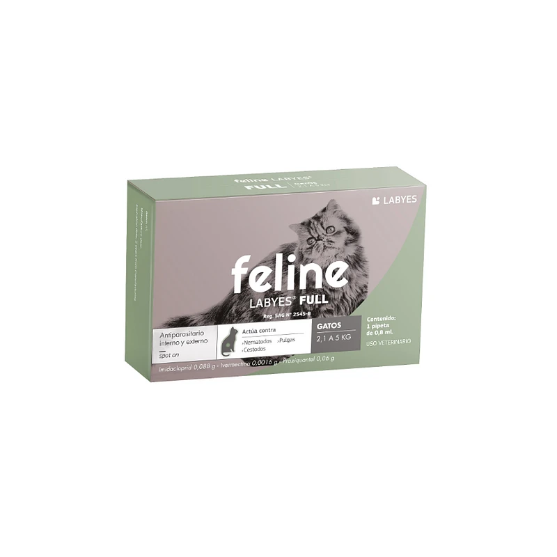 Feline Labyes Full 2.1 a 5 kg , es un antiparasitario interno y externo para gatos de aplicación spot-on. Su efectiva formulación elimina las pulgas y los parásitos internos que frecuentemente afectan a los gatos. Tiene potente efecto contra nematodos y ácaros de la sarna, y además, ejerce actividad frente a trematodos y céstodos.