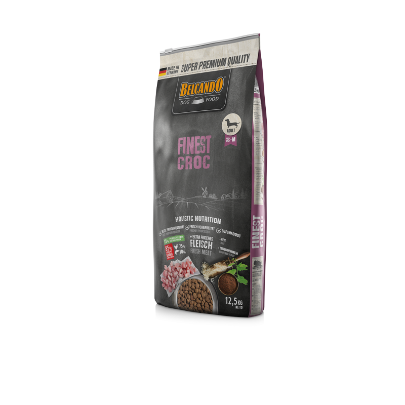 Materias primas especialmente seleccionadas, el sabroso pato y el hígado hacen de BELCANDO Finest Croc la primera opción para perros adultos de paladares exquisitos. El arroz, de muy fácil digestión, y la valiosa harina de semilla de uva prensada en frío hacen que la hora de comida sea un placer muy saludable en todos los sentidos. Un alto contenido en proteínas y grasas favorece la digestión y reduce el volumen fecal. Salsa : cuando se mezcla con agua caliente, se forma una salsa sabrosa.